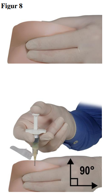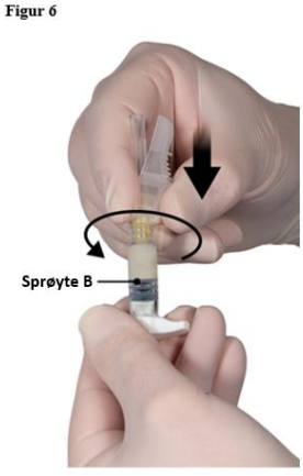 Press ut store luftbobler fra sprøyte B før administrering. Administrer produktet subkutant mens sikkerhetshetten holdes borte fra kanylen.
