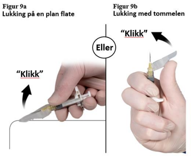 Press sikkerhetshetten ned på en plan flate med det hengslede stykket ned (figur 9a) for å dekke kanylen og låse hetten.