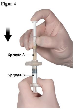 Etter blanding, hold sprøytene vertikalt med sprøyte B nederst. Sprøytene skal fortsatt være godt koplet sammen. Trekk hele innholdet inn i sprøyte B (den korte, brede sprøyten) ved å trykke inn stempelet i sprøyte A og trekke lett i stempelet i sprøyte B (figur 4).