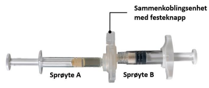 Hold sprøytene vannrett og overfør væskeinnholdet i sprøyte A inn i leuprorelinacetatpulveret i sprøyte B. Bland produktet godt i 60 sykluser ved å forsiktig dytte innholdet i begge sprøytene frem og tilbake mellom de to sprøytene (én syklus tilsvarer ett dytt med stempelet i sprøyte A og ett dytt med stempelet i sprøyte B) mens du holder systemet vannrett, for å oppnå en homogen, viskøs oppløsning (figur 3). Ikke bøy sprøytesystemet (merk a dette kan gi lekkasje da sprøytene kan skrus delvis ut).