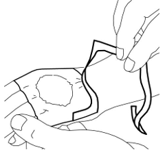 3. Trekk av papiret som er kuttet i midten av bandasjen på den siden som ikke er selvklebende (slik at det blir igjen en ramme av papir).