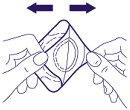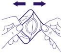 2. Dra de to lagene fra hverandre, for å separere den klebende delen fra beskyttelseslaget, som vist. Sørg for at du ikke tar på den hvite, runde puten som inneholder EMLA. |