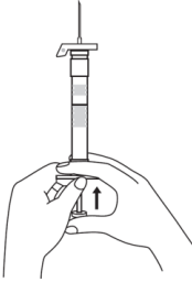 1. For å klargjøre for injeksjon holdes sprøyten rett opp (kanylen opp). Skru fast stempelet på sprøytens bunn til den bakerste gummiproppen begynner å snurre.