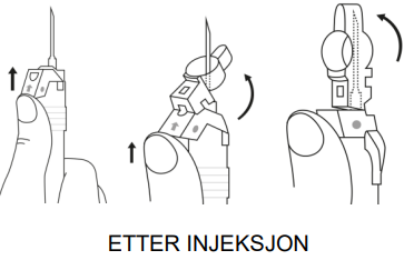 7. Trekk kanylen ut fra huden. På sikkerhetsbeskyttelsen finnes en pil. Trykk på klaffen på sikkerhetsbeskyttelsen i pilens retning rett etter injeksjonen. Da glir beskyttelsen mot kanylespissen og låses som beskyttelse for kanylen. Kontroller at det er låst ved å lytte og kjenne (når beskyttelsen låses kan du høre et «klikk» og det kjennes et «knepp»).