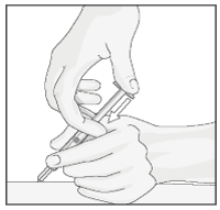 Når kanylen er fullstendig innstukket i huden skal du slippe huden som du holder i. Hold sprøyten med den ledige hånden for å stabilisere den. Press deretter stempelet for å injisere alt legemidlet med en langsom, jevn hastighet (se figur 19).