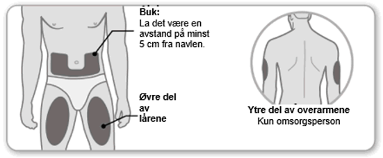 Velg et injeksjonssted midt på øvre del av låret foran eller i mageregionen 5 cm unna navlen. En omsorgsperson kan også bruke ytre del av overarmene.