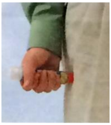 1. Grip EpiPen med den hånden du vanligvis bruker (hånden du bruker til å skrive med). Hold tommelen nærmest den blå sikkerhetshetten og grip om autoinjektoren med den orange tuppen ned.