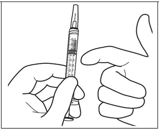 For å fjerne alle boblene og overflødig legemiddel, presses stempelet langsomt inn slik at den flate stempelkanten er på linje med streken som markerer 0,07 ml på sprøyten.