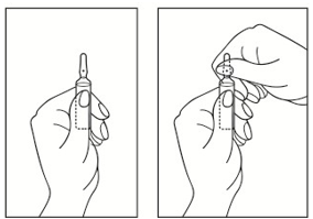 Bruk begge hender for å åpne. Hold den nedre delen av ampullen i den ene hånden og bruk den andre hånden til å bryte av den øvre delen av ampullen i retning bort fra det fargede punktet (se bildene nedenfor).