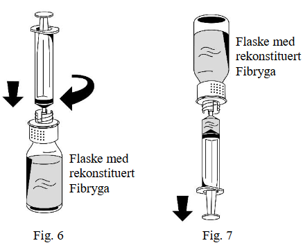 7. Mens hetteglasset med oppløsningsvæske fortsatt er festet på, virvles Fibryga-flasken forsiktig inntil pulveret er helt oppløst. For å unngå skumdannelse skal flasken ikke ristes. Pulveret skal være helt oppløst innen ca. 5 minutter. Det bør ikke ta mer enn 20 minutter å løse opp pulveret. Hvis pulveret ikke er oppløst innen 20 minutter, bør preparatet kastes.