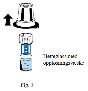 5. Hold i hetteglasset med oppløsningsvæske, og fjern blisterpakningen forsiktig fra overføringssettet (nextaro) ved å trekke det vertikalt oppover. Sørg for at overføringssettet er godt festet til hetteglasset med oppløsningsvæske (Fig. 3).