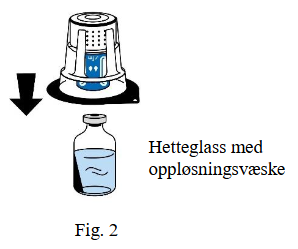 4. Plasser hetteglasset med oppløsningsvæske på en jevn, ren overflate og hold det fast. Uten å fjerne blisterpakningen, plasser den blå delen av overføringssettet på toppen av hetteglasset med oppløsningsvæske. Trykk bestemt rett ned til den klikker på plass (Fig. 2). Ikke vri mens den festes på.