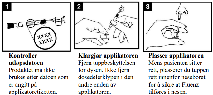 Bruk ikke Fluenz hvis utløpsdatoen er passert eller applikatoren virker skadet, for eksempel hvis stempelet er løst eller forskjøvet i forhold til neseapplikatoren, eller ved tegn til lekkasje.