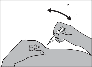 Hvis du injiserer Fragmin til et barn, skyver du nålen helt inn i huden med en rask, hurtig bevegelse, med en vinkel mellom 45° og 90° (se figur 12).