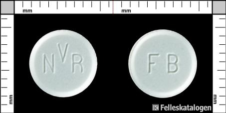 Galvus 50 mg tabletter er runde, hvite til lysegule og flate, med ”NVR” på den ene siden og ”FB” på den andre siden.