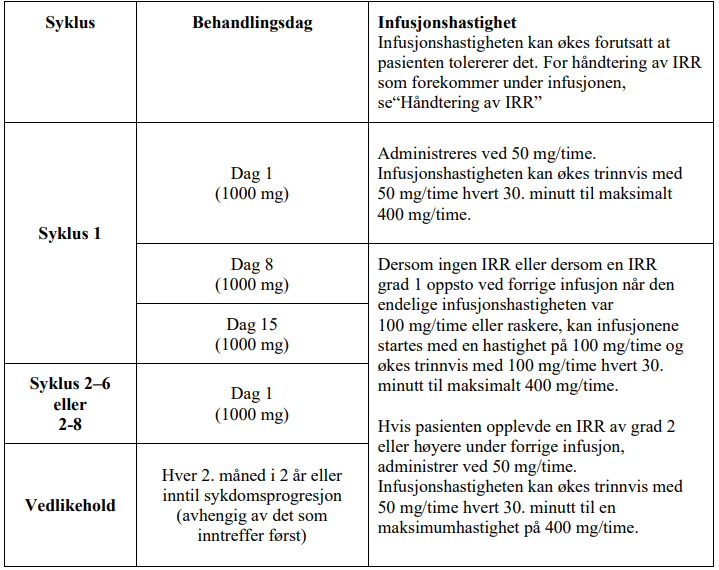 Kronisk lymfatisk leukemiTabell 4: Kronisk lymfatisk leukemi: Standard infusjonshastighet ved fravær av IRR/hypersensitivitet og anbefalinger i tilfelle en IRR forekom ved forrige infusjon