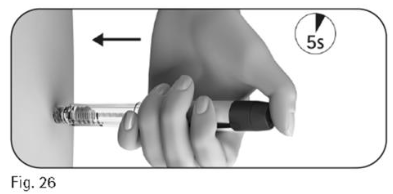 5.3 Hold doseinnstillingsknappen inne i minst 5 sekunder før du trekker kanylen ut av huden (figur 26).