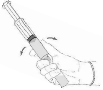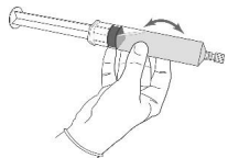 4. Uten å trekke kanylen opp fra hetteglasset holdes hetteglasset med pulver og sprøyten i et fast grep mens det ristes forsiktig for å sikre at pulveret blir fullstendig oppløst.