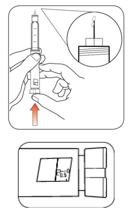 Fortsett å holde pennen med kanylen pekende oppover. Press doseringsstempelet inn inntil det stopper og ”0” vises i doseringsvinduet. Hold doseringsstempelet inne og tell sakte til 5.