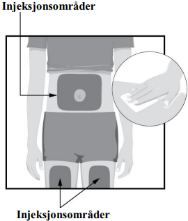 Pek den hvite pilen mot injeksjonsstedet (lår eller mage).