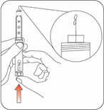 Fortsett å holde pennen med kanylen pekende oppover. Press doseringsstempelet inn inntil det stopper og ”0” vises i doseringsvinduet. Hold doseringsstempelet inne og tell sakte til 5.