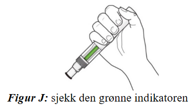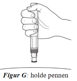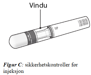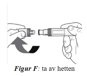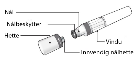 Figur A viser pennen med hetten tatt av. Ikke ta av hetten før du er klar til å injisere.