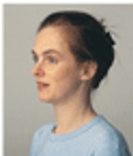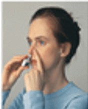 6. Før nesestykket inn i det andre neseboret så langt som det føles komfortabelt (ca 1 cm). Hold hodet rett opp som vist på bildet. Pust forsiktig inn gjennom nesen (ikke sniff) og trykk samtidig inn det blå stempelet med tommelen. Stempelet kan føles noe trått, og noen ganger høres et klikk. Fjern nesesprayen. Pust ut igjen gjennom munnen