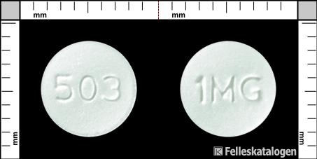 Depottabletter på 1 mg er runde og hvite, harde tabletter preget med 1MG på den ene siden og 503 på den andre siden.