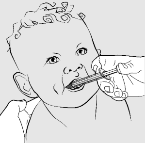 Plasser tuppen på sprøyten inne i munnen til barnet med tuppen mot ett av kinnene.