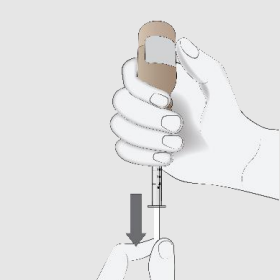 7. Snu flasken forsiktig opp-ned og trekk ned stempelet til toppen av den svarte proppen er på linje med den foreskrevne dosen på sprøytehylsen.