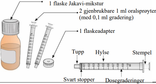 Les denne «Bruksanvisningen» nøye før du begynner å bruke Jakavi. Helsepersonell bør vise deg hvordan du måler og administrerer en dose Jakavi på riktig måte. Hvis du har spørsmål om bruk av Jakavi, ta kontakt med lege eller apotek.