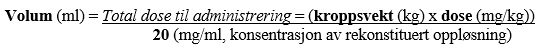 Bestem volumet på den rekonstituerte oppløsningen som trengs basert på en dose på 3,6 mg av trastuzumabemtansin/kg kroppsvekt: