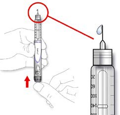 D. Knips på insulinbeholderen slik at eventuelle luftbobler stiger opp mot kanylen.