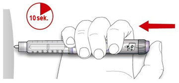 D. Hold injeksjonsknappen helt inne. Tell sakte til 10 før du trekker kanylen ut. Dette sikrer at hele dosen blir injisert.