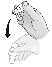 6. Før lokket settes på igjen rister du flasken én gang nedover for å fjerne eventuell oppløsning fra flasketuppen. Dette er nødvendig for å sikre at flasken fortsatt kan brukes.