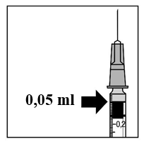 8. Fjern forsiktig luften fra sprøyten sammen med den overflødige oppløsning og juster dosen slik at innholdet skyves ut til sprøytestempelet står overfor streken som angir 0,05 ml på sprøyten. Sprøyten er nå klar til injeksjon.