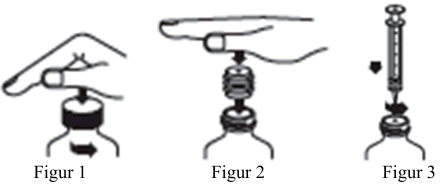 2. Kun ved første gangs bruk: En adapter som skal presses inn i flasken og en doseringsssprøyte følger med. Adapteren settes på toppen av flasken for å gjøre det lettere å fylle doseringssprøyta med væske fra flasken. Hvis apteren ikke allerede er på plass, ta adapteren og 5 ml sprøyten ut av plastposen. Med flasken på et flatt underlag presses adapteren inn i flaskehalsen med den flate delen av adapteren vendende opp (figur 2).
