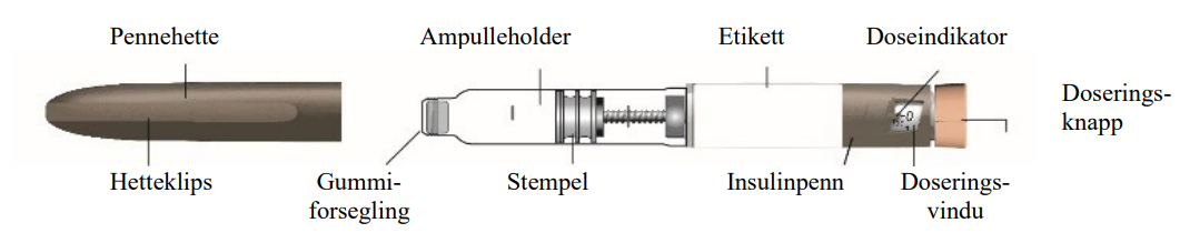 Les bruksanvisningen for hvordan man bruker den ferdigfylte insulinpennen. Følg anvisningene nøye. Her er noen påminnelser: