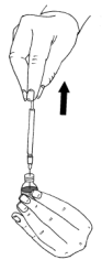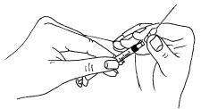 Stikk kanylen gjennom gummiproppen på hetteglasset med pulver og sprøyt all væsken ned i hetteglasset. La væsken renne ned langs veggen på innsiden av hetteglasset slik at det dannes minst mulig bobler.