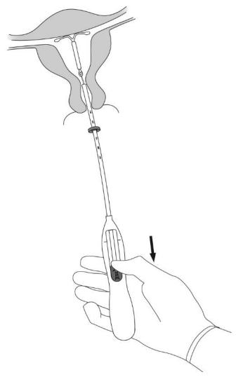 7. Mens du holder innføringshylsen på plass, frigjøres Mirena ved å skyve glideren helt tilbake (Figur 7). Mens du fortsatt holder glideren helt tilbake, fjernes innføringshylsen forsiktig ved å trekke den ut. Kutt trådene slik at 2-3 cm er synlig utenfor cervix.