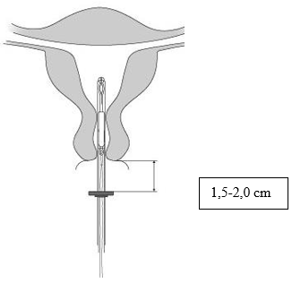 4. Mens glideren holdes i ytterste posisjon, føres innføringshylsen videre inn i cervix inntil måleringen er ca. 1,5-2,0 cm fra uterin cervix (Figur 4).