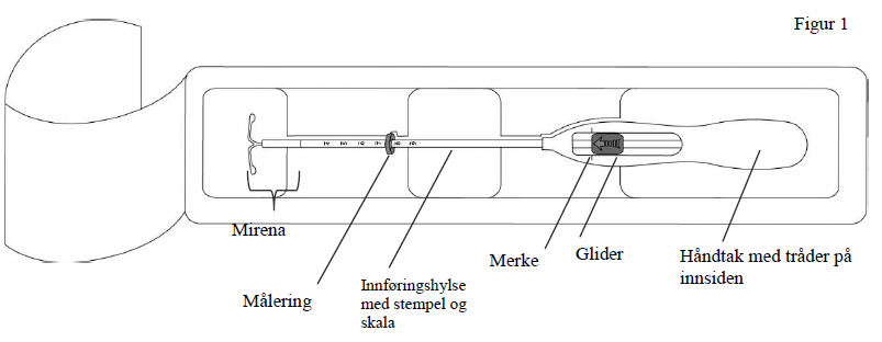 Mirena sitter i en innføringshylse som ligger i en steril pakning som ikke skal åpnes før umiddelbart før innsetting. Skal ikke steriliseres på nytt. Mirena er kun til engangsbruk. Skal ikke brukes dersom indre emballasje er skadd eller åpnet. Skal ikke settes inn etter utløpsdatoen (måned og år) som er angitt på etiketten.