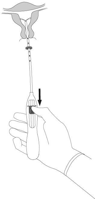 6. Før innføringshylsen forsiktig videre mot fundus i uterus inntil måleringen berører cervix. Mirena er nå plassert ved fundus. (Figur 6).