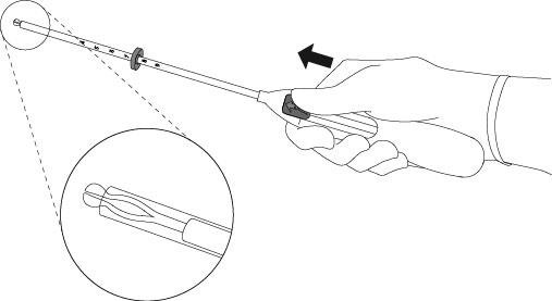 5. Mens du holder innføringshylsen på plass, skyves glideren tilbake til merket for å folde ut de horisontale armene på Mirena (Figur 5). Vent i 5-10 sekunder på at de horisontale armene skal folde seg helt ut.