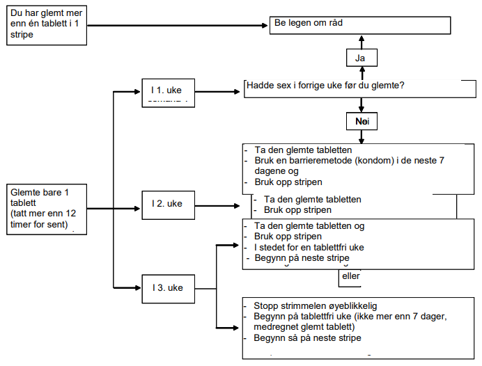 Diagrammet nedenfor beskriver hvordan du går frem hvis du glemmer å ta tabletten(e):