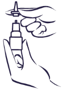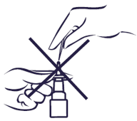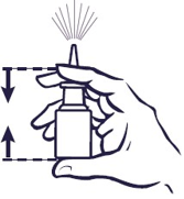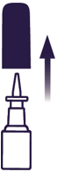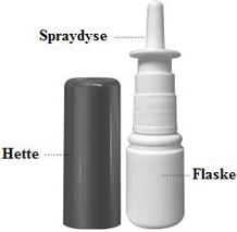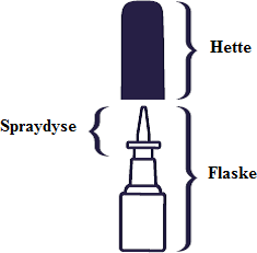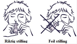 Hold flasken rett og plasser spraydysen i det andre neseboret, så langt opp i nesen som mulig uten ubehag. Pust forsiktig inn gjennom nesen med lukket munn samtidig som du presser spraydysen ned slik at en spraydose avgis.