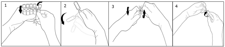 For å løsne en enkeltampulle, vri én av ampullene i motsatt retning enn resten av ampullene i pakningen uten å berøre ampullenes øvre del (bilde 1). Rist ampullen med én enkelt bevegelse som vist under, slik at væske som ligger i hetten fjernes (bilde 2). For å åpne ampullen, vri nedre del og øvre del på ampullen i motsatte retninger inntil øvre del brekkes av (bilde 3). Koble ampullen til luer-sprøyten eller luer-lock-sprøyten (bilde 4).