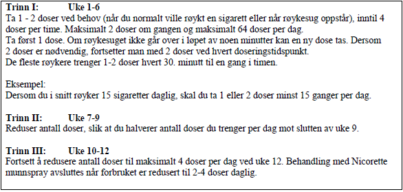 Når et røyksug oppstår, bruk 1-2 spray istedenfor en sigarett for å lette røyksuget. Sprayen erstatter en sigarett, ikke røyk kort tid etter at du har brukt sprayen. Bruk av sprayen uten å redusere antall sigaretter vil gjøre at du føler deg dårlig (se avsnittet «Dersom du tar for mye av Nicorette»). Reduser antall sigaretter per dag så mye som mulig og erstatt dem med en spray. Dersom du ikke har oppnådd røykereduksjon 6 uker etter behandlingsstart, bør du snakke med en lege. Du bør kutte ut sigarettene fullstendig så snart du føler deg klar for det, men ikke senere enn 12 uker etter behandlingsstart. Etter røykeslutt, reduser gradvis antall spray per dag. Behandlingen med Nicorette munnspray stanses når daglig bruk er redusert til 2-4 spray.