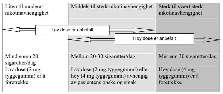 Ved behandlingsstart kan vanligvis 1 tyggegummi tygges hver eller annenhver time. Normalt er 8-12 tyggegummier per dag tilstrekkelig uavhengig av styrke. Ikke overstig en døgndose på 24 tyggegummier av 2 mg styrken, eller 15 tyggegummier av 4 mg styrken. Ta ikke mer enn 1 tyggegummi per time.