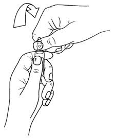 Med tommelen på den andre hånden presses det på det fargede punktet til ampullen knekker som vist på tegning 2.